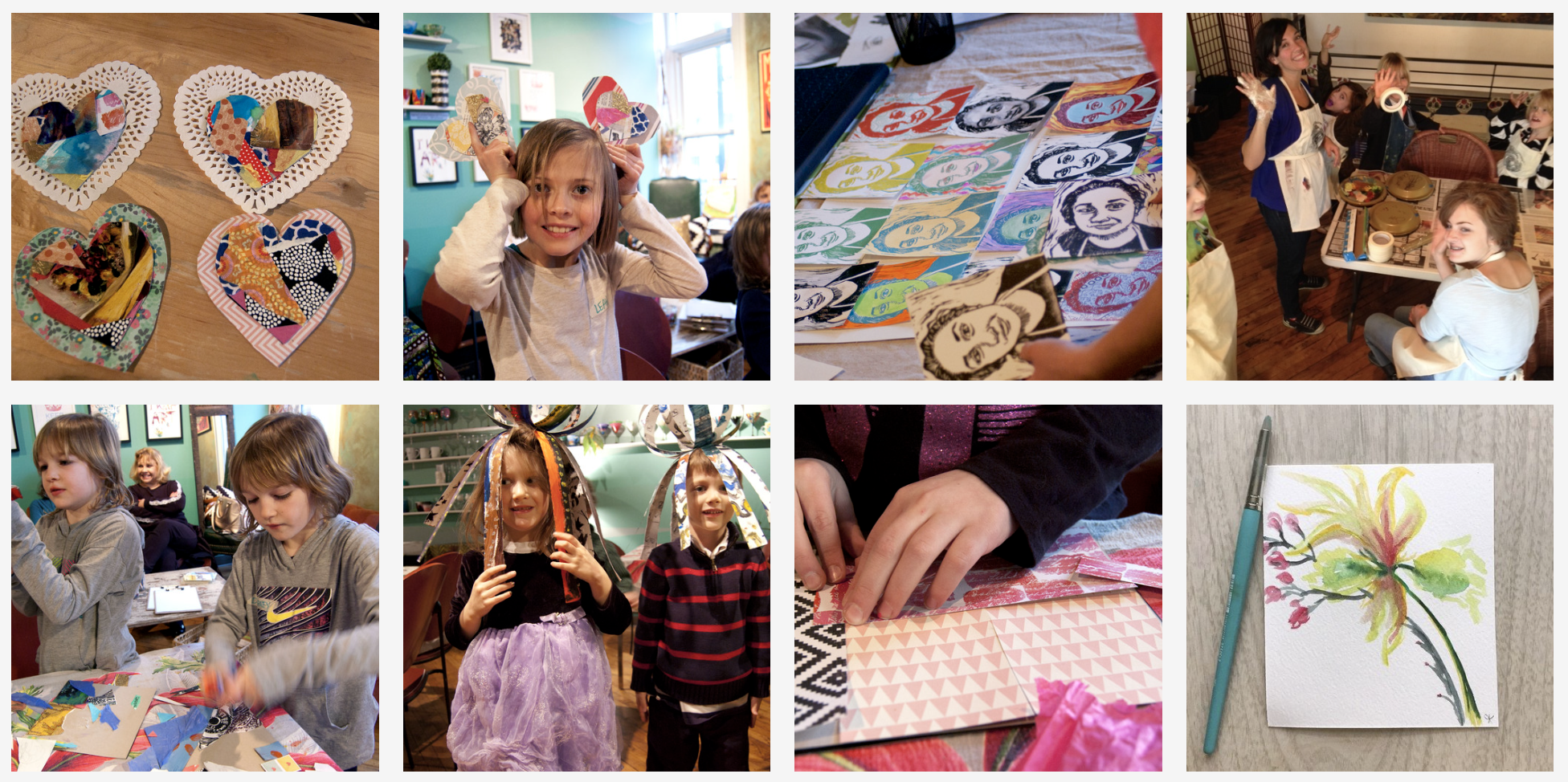 Printmaking, valentine’s card making, paper sculptures, and watercolors at ArtSpa
